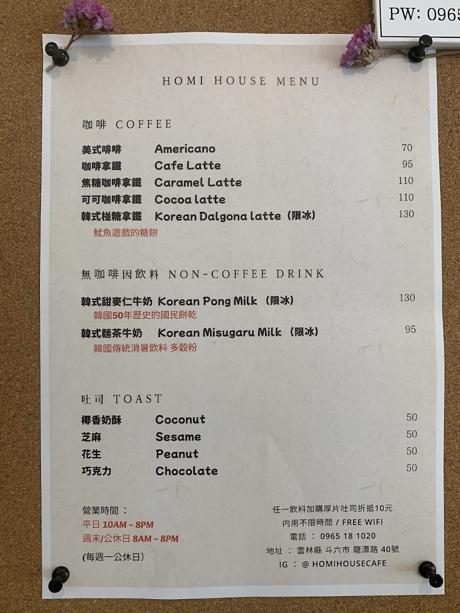 Welcome to Homi House Cafe, a delightful Korean-inspired café nestled in the heart of Douliu City, Taiwan. Conveniently located at No. 40, Longtan Rd, this charming spot offers a unique menu that highlights Korean coffee culture. Guests rave about the Korean Dalgona Iced Coffee and Peongtang Latte, both of which capture authentic flavors that excite the palate.